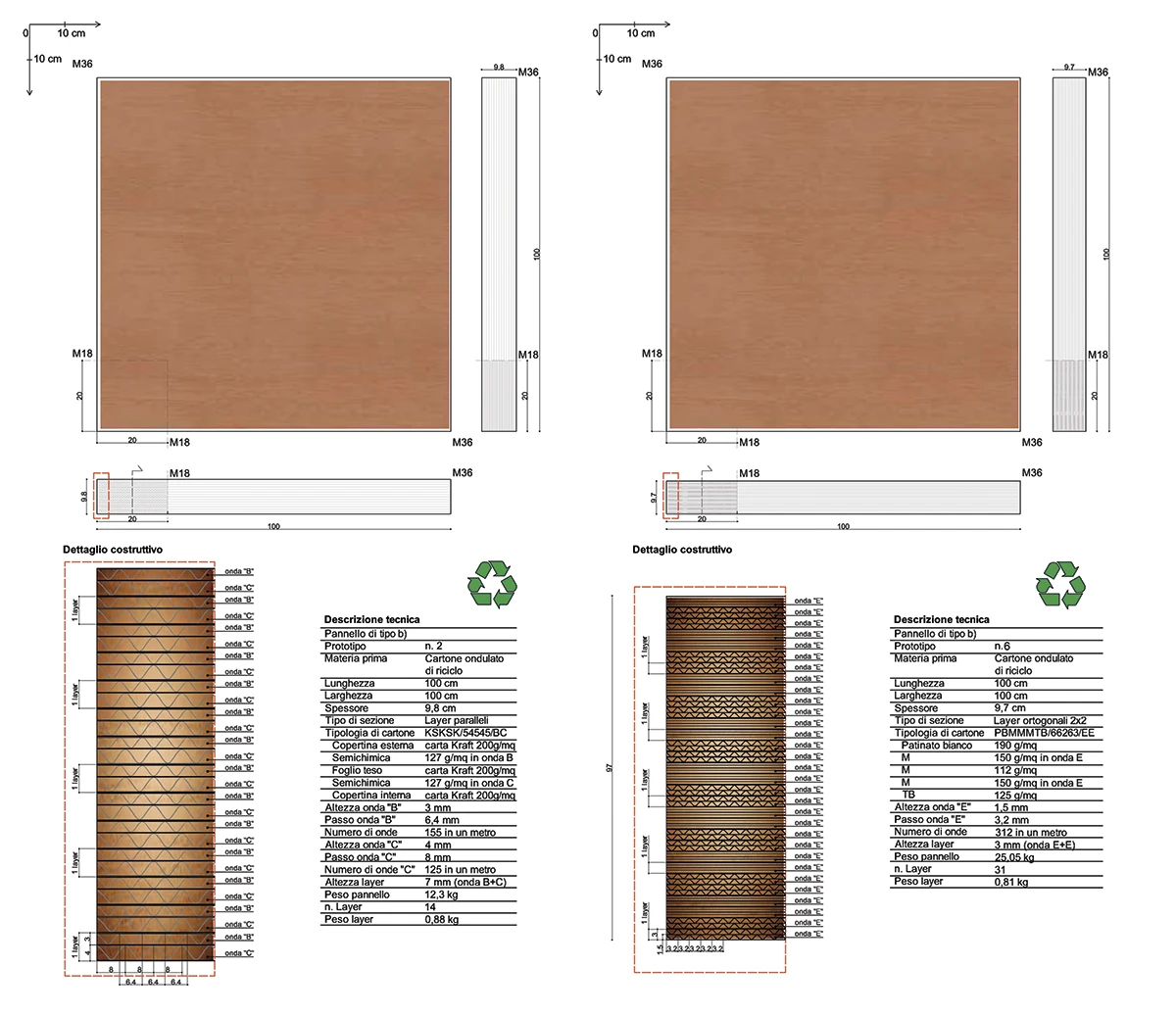 The layers were placed according to three different orientations: parallel, orthogonal 1x1 and orthogonal 2x2. The panel incorporates internal slots to case the sensorial architecture. As regards the finishing, it was expected that the panel has a fire protection treatment through paints already on the market and a completion layer created with printing on the cardboard. This finishing was preferred to other compatible typologies because, after some tests, it was found to be the one that least affected the signal of the sensory system.