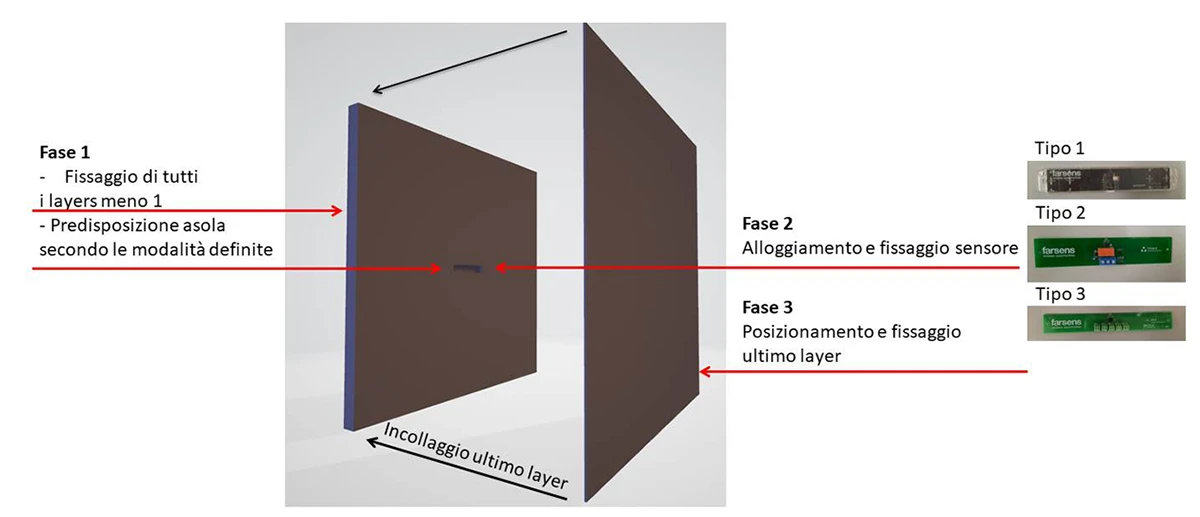 The assembly process involves three phases described in figure 3. Firstly, the individual layers will be glued with the exception of the last one, and the slot will be prepared according to the design indications. Subsequently, one of the three types of sensors will be housed and fixed and lastly, the remaining layer will be glued (Fig. 3).