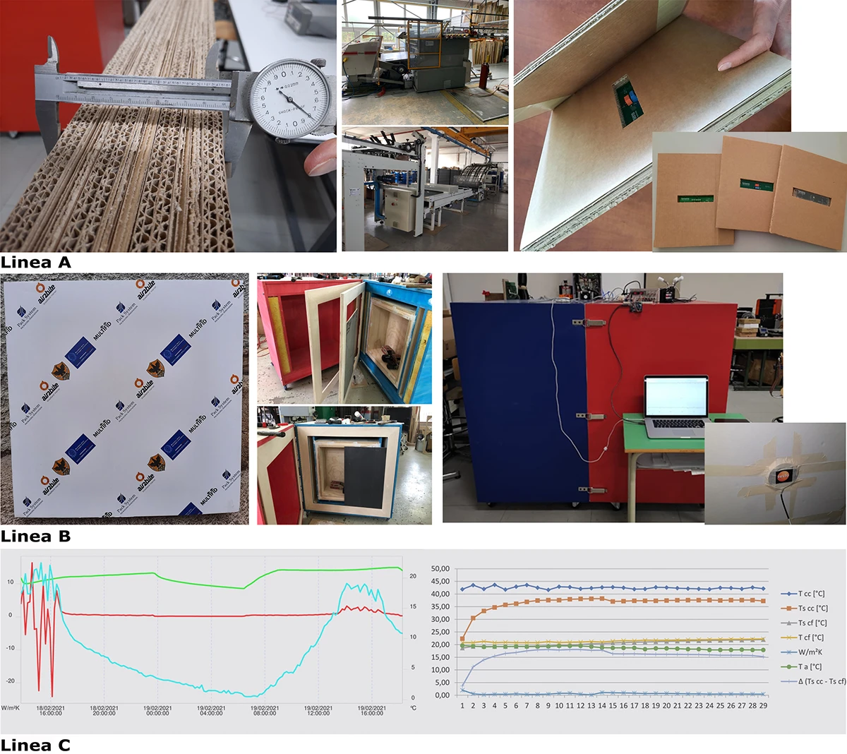 Produzione dei pannelli e test. Linea A, alcuni dei prototipi prodotti e delle macchine industriali impiegate. Linea B, finitura superficiale del pannello, scatti inerenti le fasi di costruzione della Guarded Hot Box e di test. Linea C, output grafico rispettivamente di analisi termoflussimetrica (a sinistra), e Guarded Hot Box (a destra),