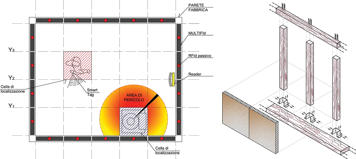 The MULTIFId architecture was designed with the aim of implementing safety in factories through the control of aspects such as the entry of workers into risk areas and man-machine and man-robot interaction. The panel position on the walls of the factory allows the partition of the internal volume into portions that can be uniquely identified through Cartesian coordinates. In this way, the position of each resource within the volume can always be known if it is equipped with a smart tag. This system may mitigate the risk in many dangerous conditions, such as in the case of an isolated worker in the hypothesis of a man-down recovery, or in the event that an unauthorised operator enters the risk area of a machine/robot. All these things may be managed remotely, through alerts, warnings and direct communications to the rescuers and to the corporate HPPS, Head of the Prevention and Protection Service. The designed system consists of a tag with chip and antenna, an additional antenna that communicates with tag one through radio waves, a reader that, on the one hand, exchanges data with RFID tags and, on the other, interfaces to a computer to which it is connected via an interface middleware. Moreover, the panel is equipped with humidity sensors for continuous monitoring. Similar to the construction system, the sensory system has also been the subject of many tests and laboratory trials to verify the correct signal transmission and efficient operation.